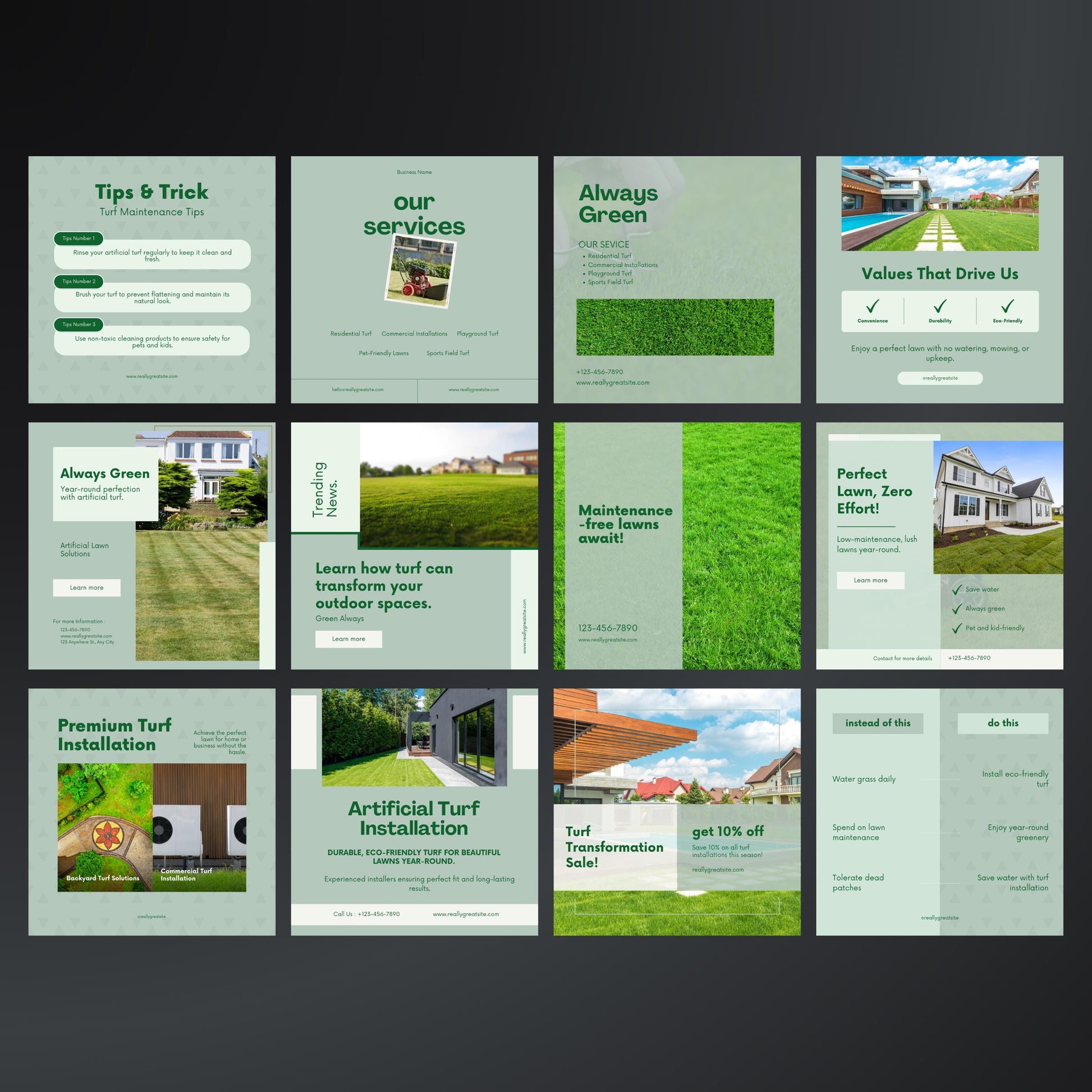 Use these professional templates to highlight the benefits of synthetic turf, attract new local clients, and keep your feed looking clean, modern, and professional.