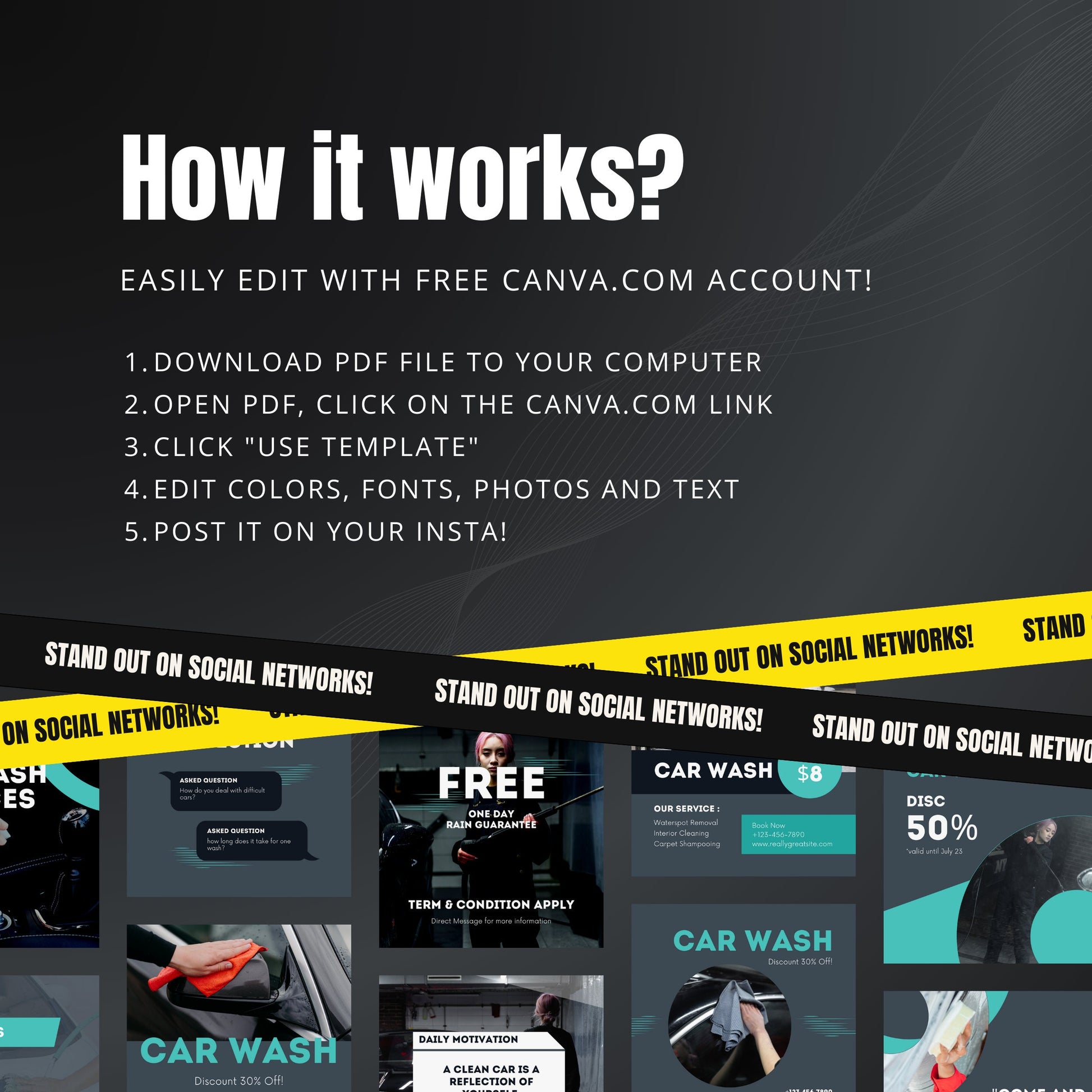 This set includes 50 fully editable Instagram post and story templates, perfect for car wash services, auto detailers, and cleaning professionals who want to promote their offers, show before-and-after results, and highlight customer satisfaction.