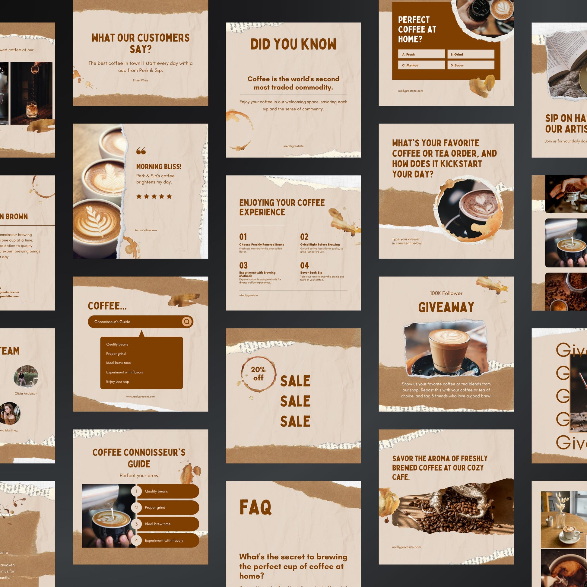 This set of 68 expertly designed Canva templates is perfect for cafés, coffee roasters, baristas, and beverage brands looking to stand out on Instagram or Facebook.