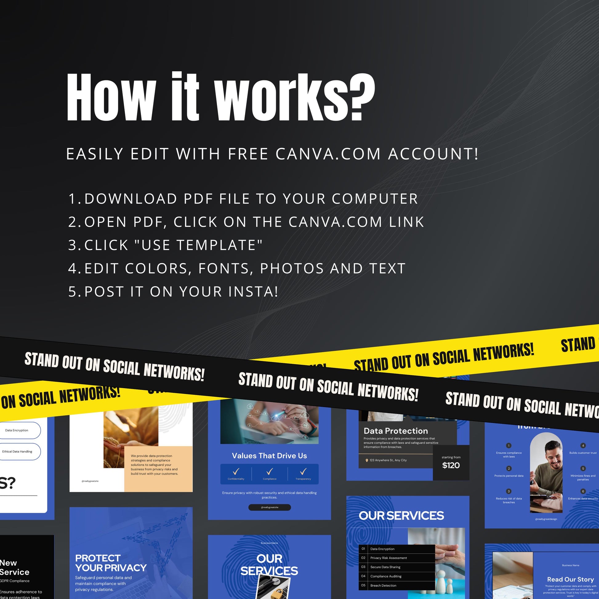 Each template is professionally designed to help you educate your audience, build trust, and showcase your expertise in data security, GDPR compliance, and online privacy. Customize every post in Canva Free or Pro - easily adjust text, colors, and branding to match your business identity.