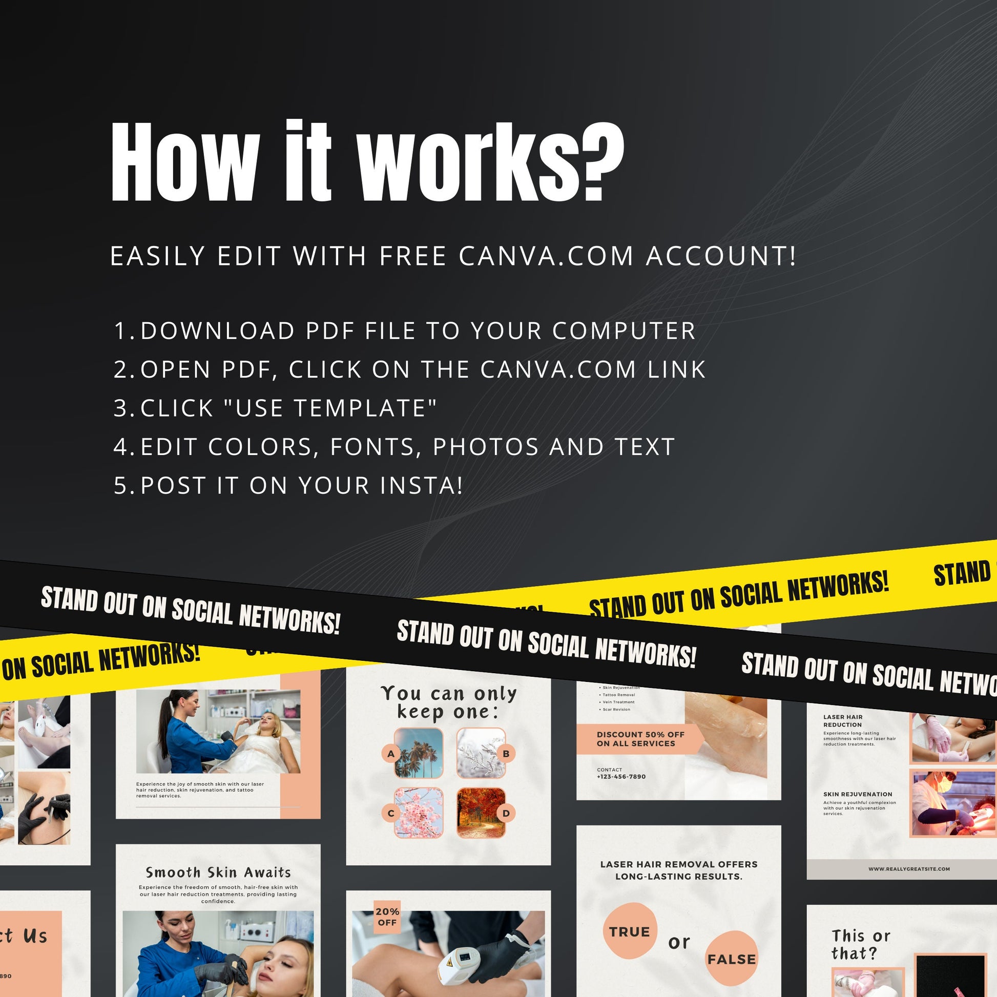 Promote your laser hair removal services with confidence and style using these 50 professionally designed Canva templates, created especially for beauty salons, medspas, and estheticians. ✨💆♀️