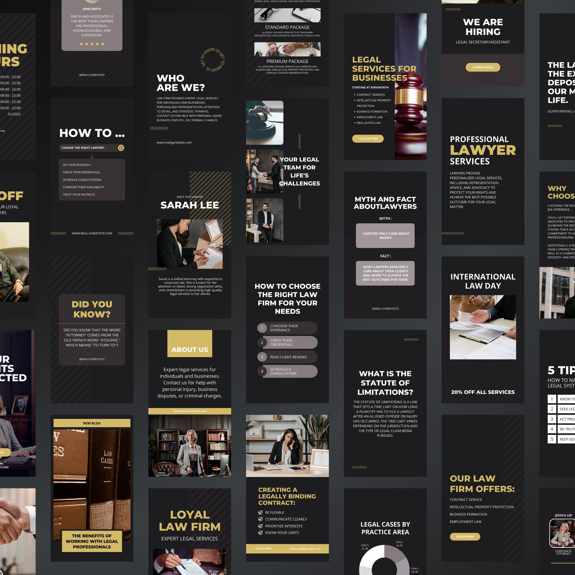 Perfect for promoting services, sharing legal tips, client testimonials, or highlighting your team - all fully editable using Canva’s Free or Pro version.