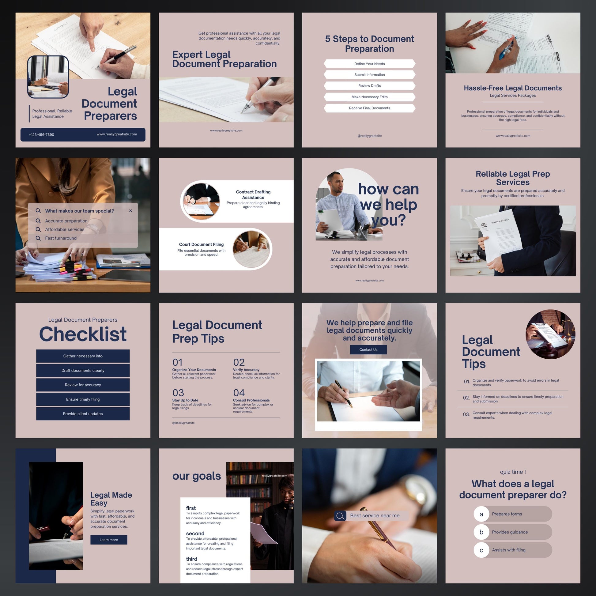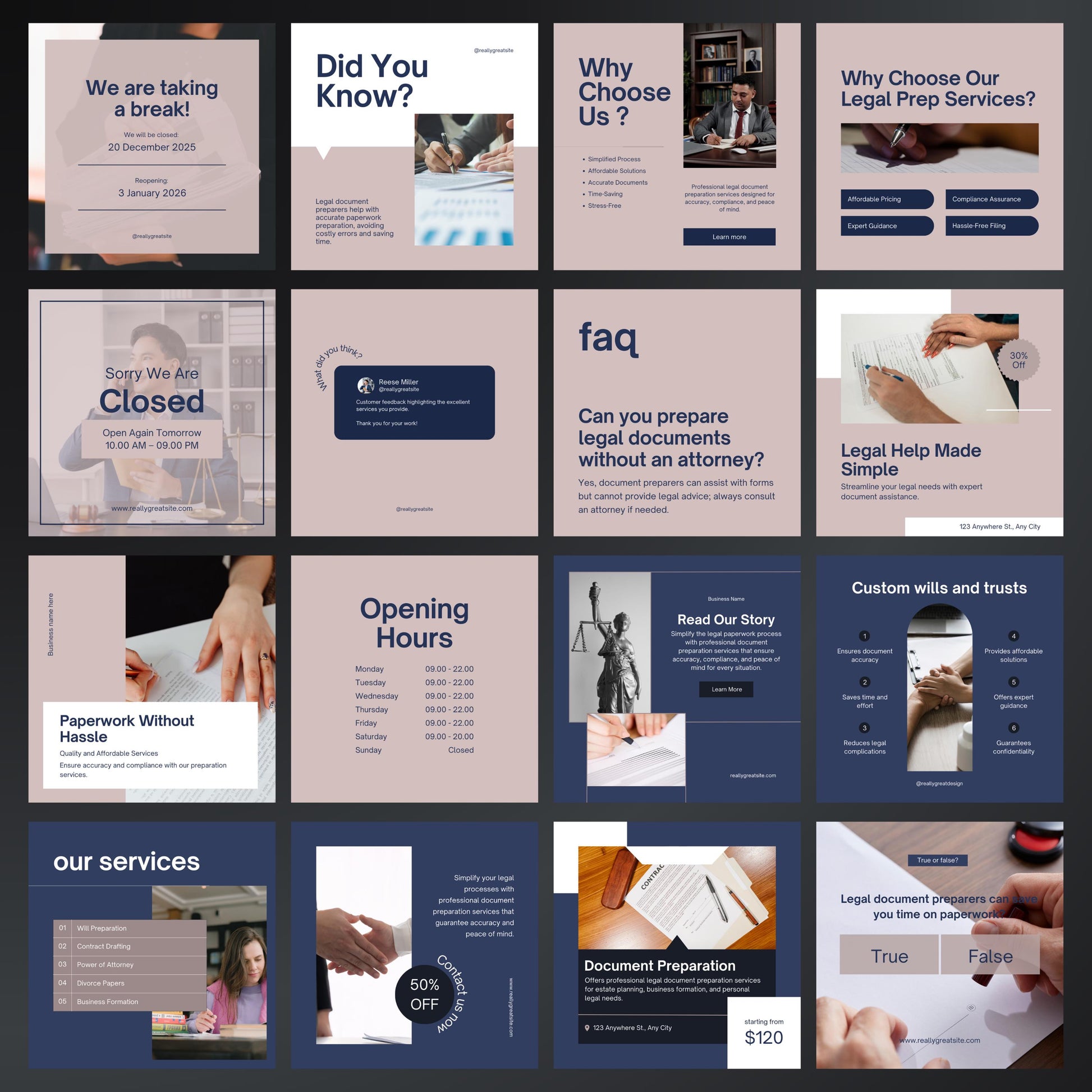 Use these templates to share legal tips, highlight your services, or promote document preparation for contracts, wills, business filings, or estate planning.