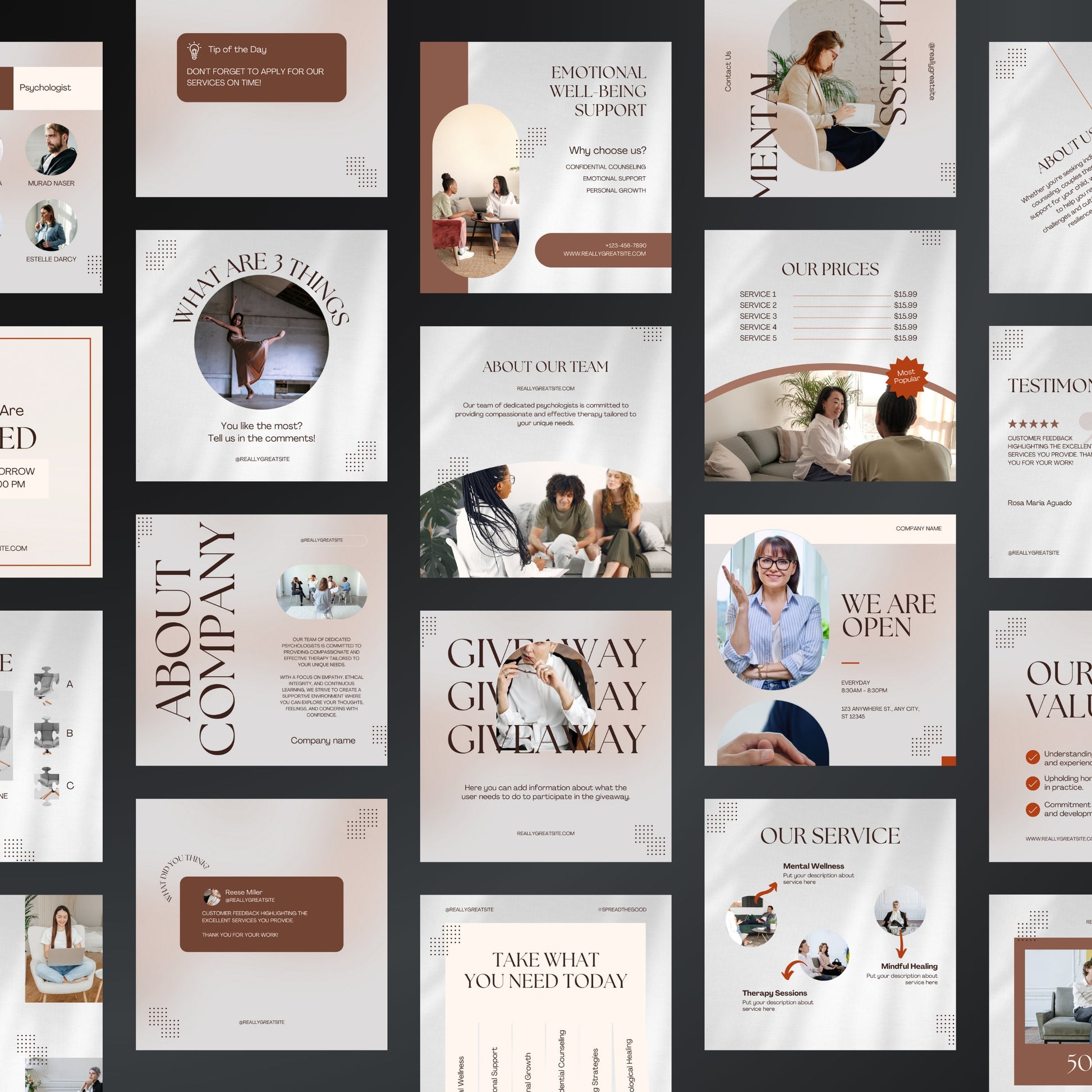 Promote your psychology practice, therapy services, or mental health coaching with this collection of 70 professionally designed Canva templates.