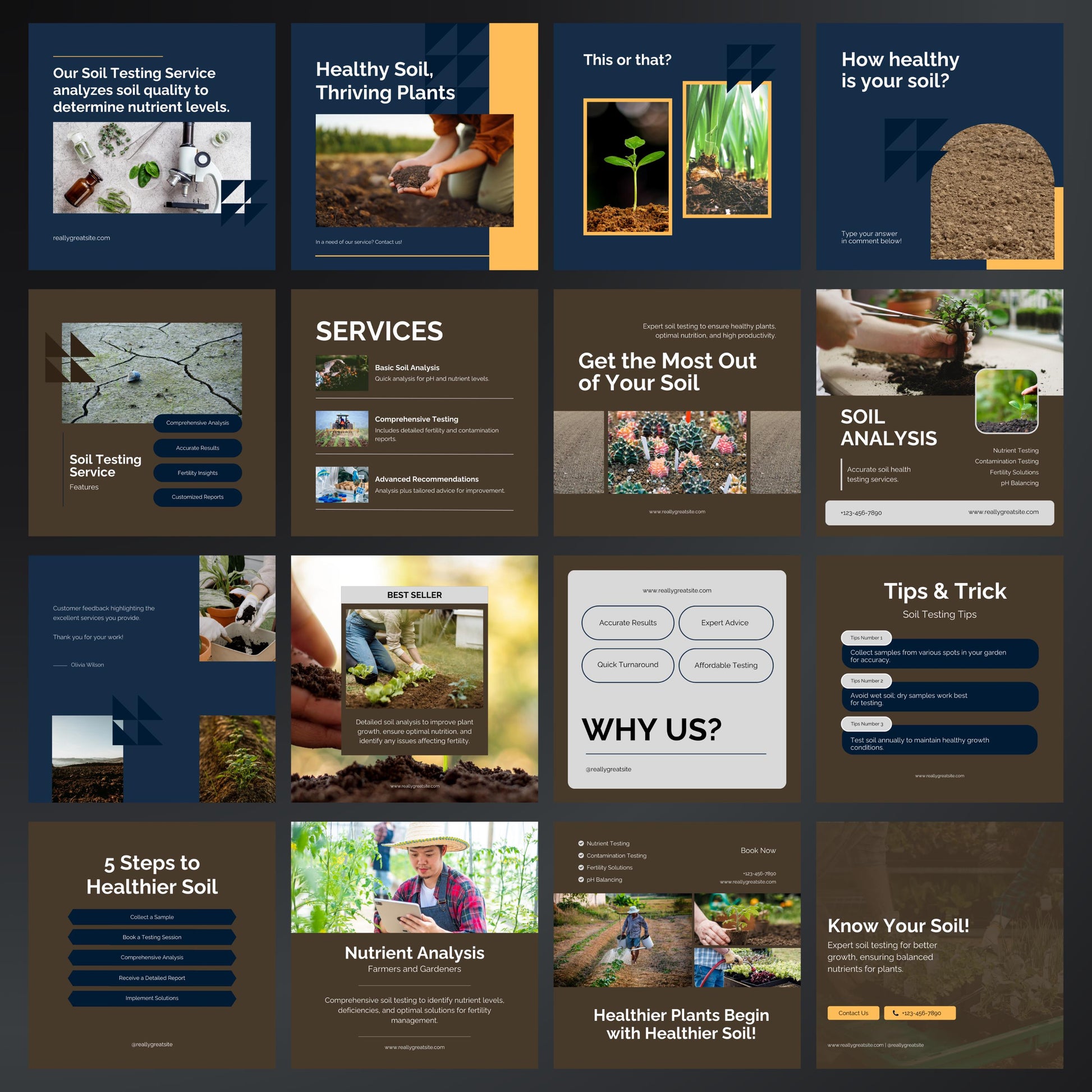 This collection of 70 expertly designed Canva templates is perfect for soil testing labs, agricultural consultants, and environmental specialists who want to showcase their services, share soil health tips, or promote sustainable land management practices on social media.
