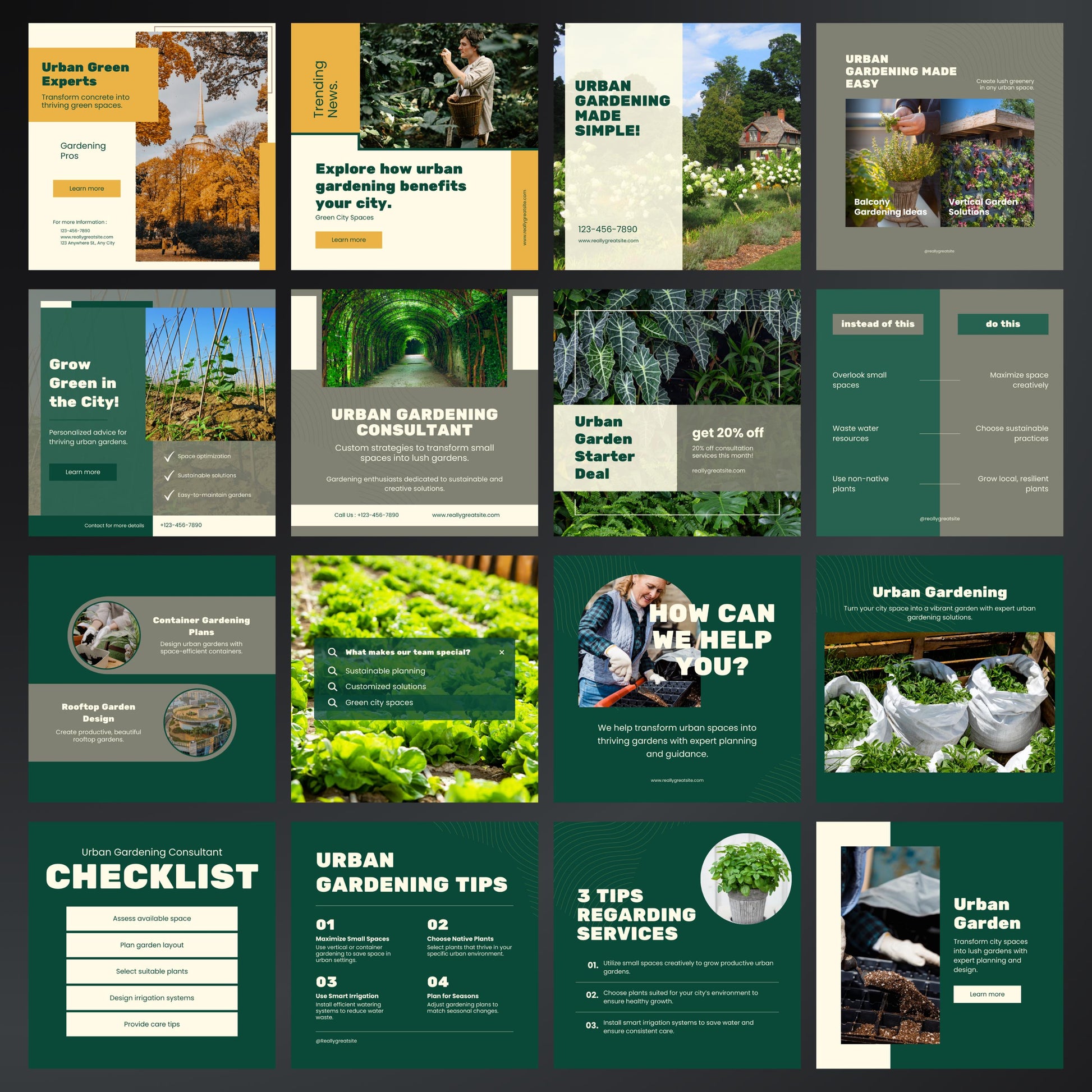 This collection includes 75 fully editable Instagram post templates, perfect for garden consultants, eco-friendly creators, and small-space gardening enthusiasts. Each layout is crafted to help you share urban gardening tips, sustainability ideas, before-and-after transformations, and plant care insights - all while keeping your feed stylish and professional.